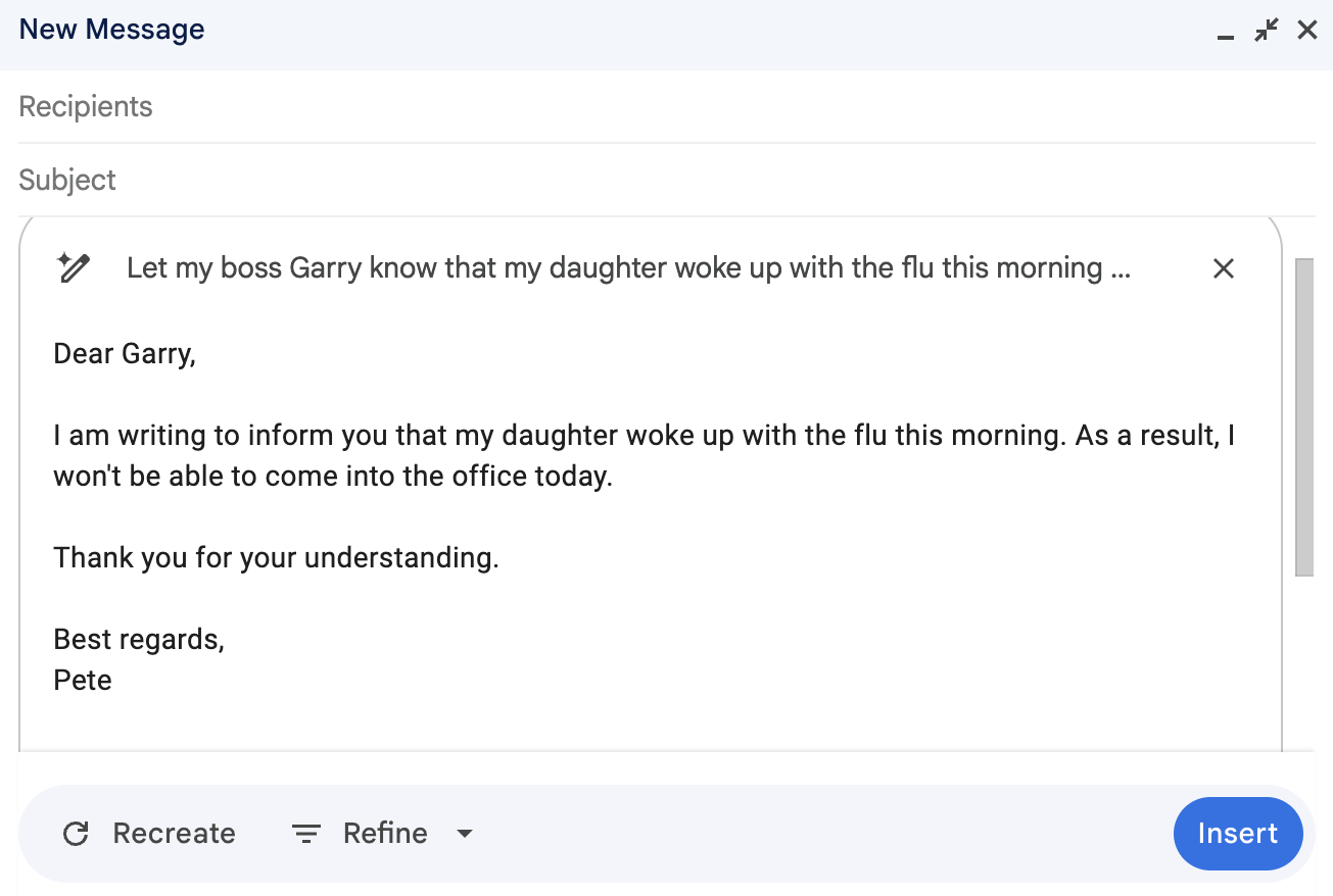 As you can see, Gemini has produced perfectly reasonable draft that unfortunately doesn’t sound anything like an email that I would actually write. If I'd written this email myself, it would have sounded something like this: